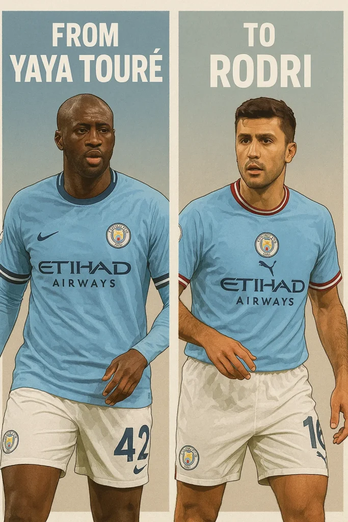 จากยุคทองของ Yaya Touré ที่พาทีมเรือใบสีฟ้าก้าวสู่แชมป์พรีเมียร์ลีกครั้งแรก จนถึงยุคปัจจุบันที่ Rodri กลายเป็นแกนหลักในการคว้า Treble ในปี 2023 — เรื่องราวของการเปลี่ยนผ่านนี้สะท้อนวิวัฒนาการทั้งด้านแท็กติก บุคลากร และความทะเยอทะยานของสโมสร